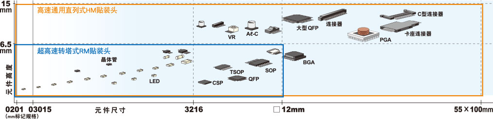 这是一种万能型贴装头,不仅具备高速性,而且还兼备通用性,从0201的超小型元件到55×100mm、高度15mm的大型元件均可对应。另外,通过与RM贴装头进行组合使用,还可高速贴装所有尺寸的元件。