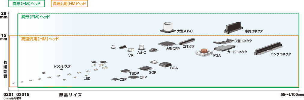 高速通用(HM)贴装头※1:0201mm ~ W55 × L100mm、高度15mm以下 |