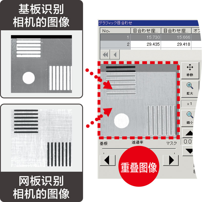 在显示屏上对2个图像进行图层重叠,可直观确认基板与网板的相对位置。无需掌握专门技巧,即可立即对印刷定位进行参数微调。