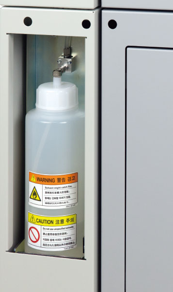 在设备的前面设置有大容量的溶剂罐。除了可在生产中更换溶剂之外,还易于对溶剂的剩余量进行目视确认。