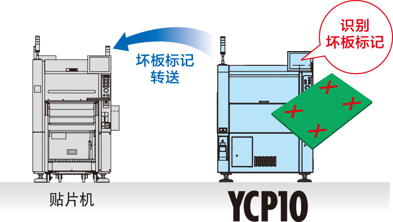 可将YCP10识别的坏板标记信息转送到贴片机上,从而削减循环时间的损耗、提高生产率。
